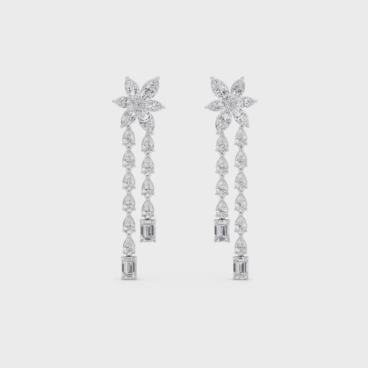 These elegant diamond drop earrings feature a delicate floral design at the top, formed by marquise and round lab grown diamonds that create the look of a sparkling flower in bloom. From this, a graceful cascade of pear shaped diamonds flows downward, beautifully accented beneath with striking emerald cut diamonds that add a modern, structured touch to the design.